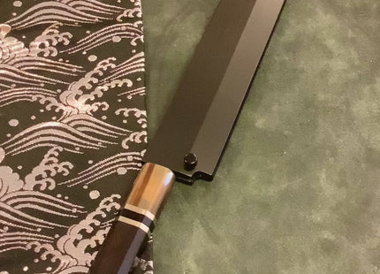 Our Yoshihiro Gintsuru knives are complemented by a traditional Japanese handcrafted Ebony handle with a double ironwood bolster and sterling triple ring, along with a protective wooden Saya cover for safe storage. Whether for sushi, sashimi, or delicate tasks, even the simplest culinary jobs are elevated with a handcrafted knife that is both beautiful and functional.