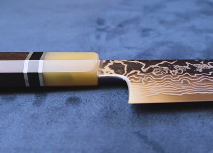 Suminagashi, meaning "floating ink," describes the beautiful marbled wave-like patterns that extend from tip to heel of the blade, revealing a unique mosaic with each sharpening. The creation of these intricate patterns requires the skill of the most talented artisans, resulting in knives that blend aesthetics and performance seamlessly. The craftsmanship involved in producing knives of this caliber speaks volumes about the extraordinary skill of our artisans.