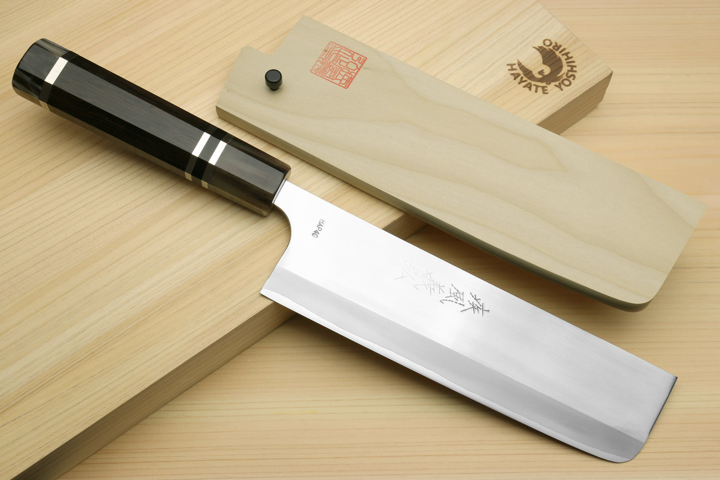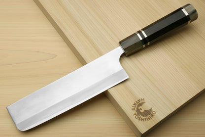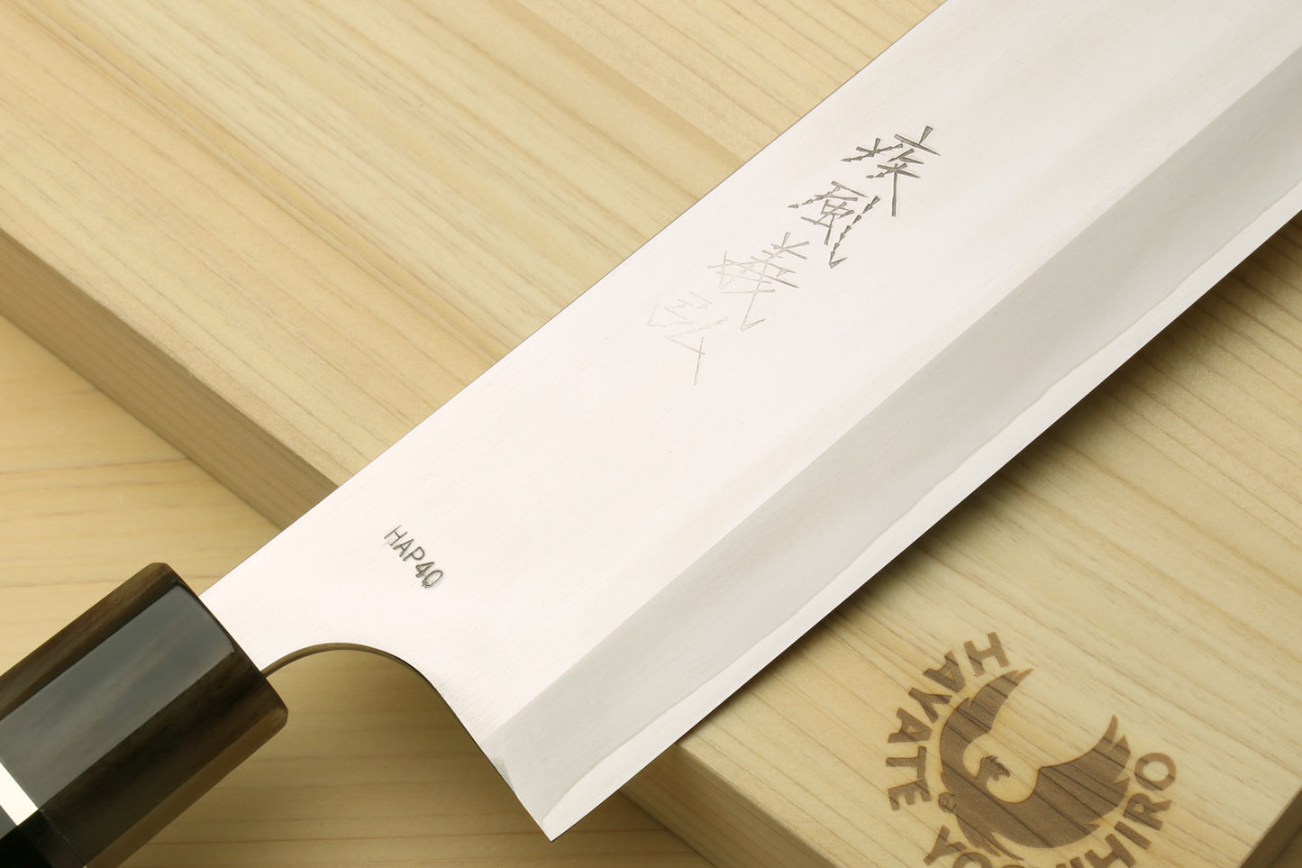 Our Yoshihiro HAP40 High Speed Stainless Steel Nakiri is a state-of-the-art handcrafted Japanese chef's knife that embodies the pinnacle of cutting performance. HAP40 (Funmatsu Haisu) stainless steel is poised to become one of the premier steels on the stainless steel knife market, offering exceptional edge retention and sharpness like few others. The HAP40 high-speed steel core, with a Rockwell hardness of 65-66, is clad in softer stainless steel, enhancing both durability and ease of sharpening.
