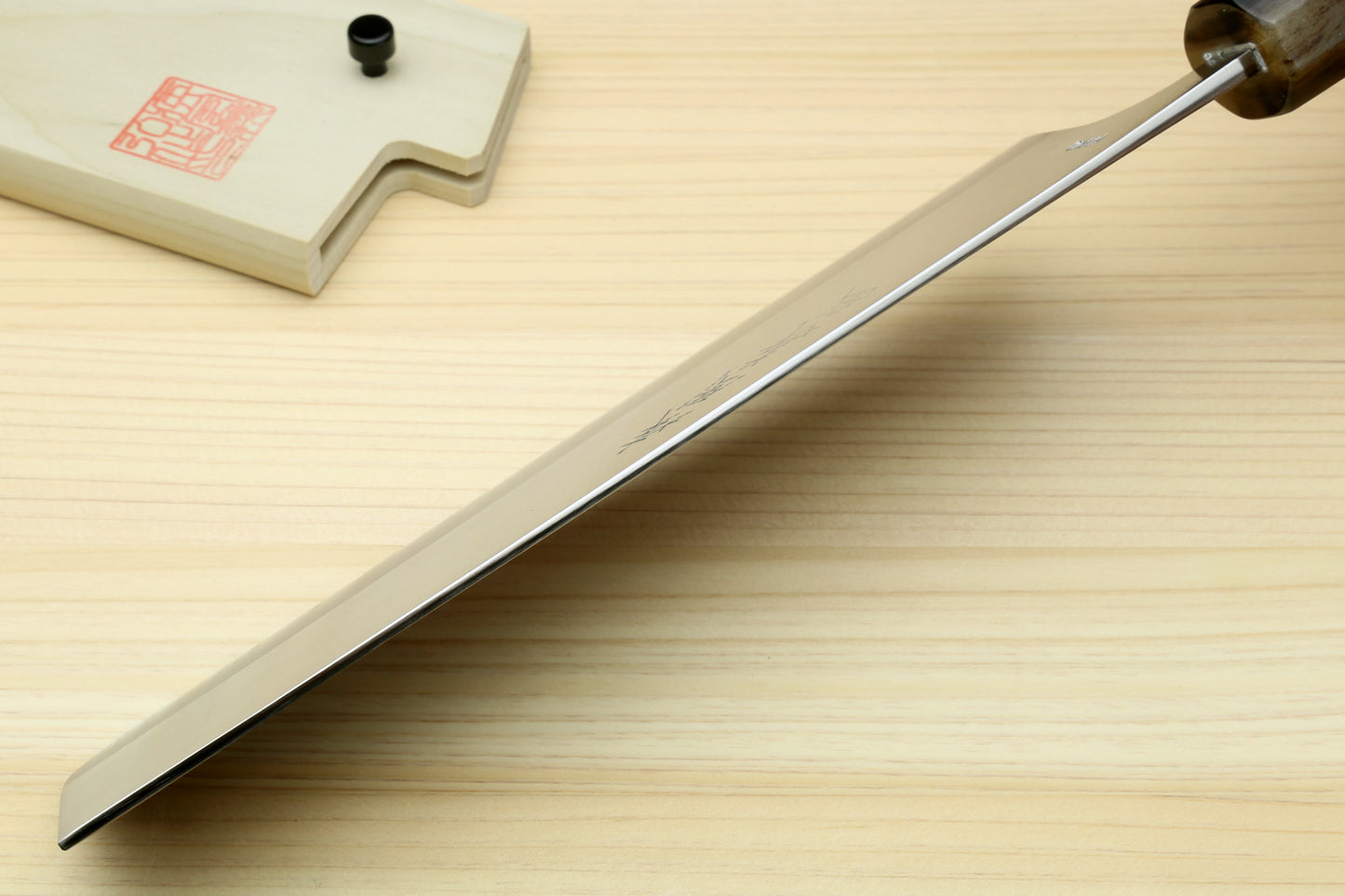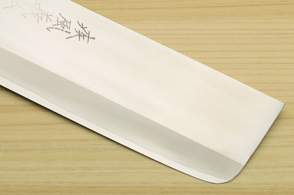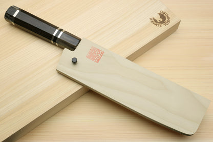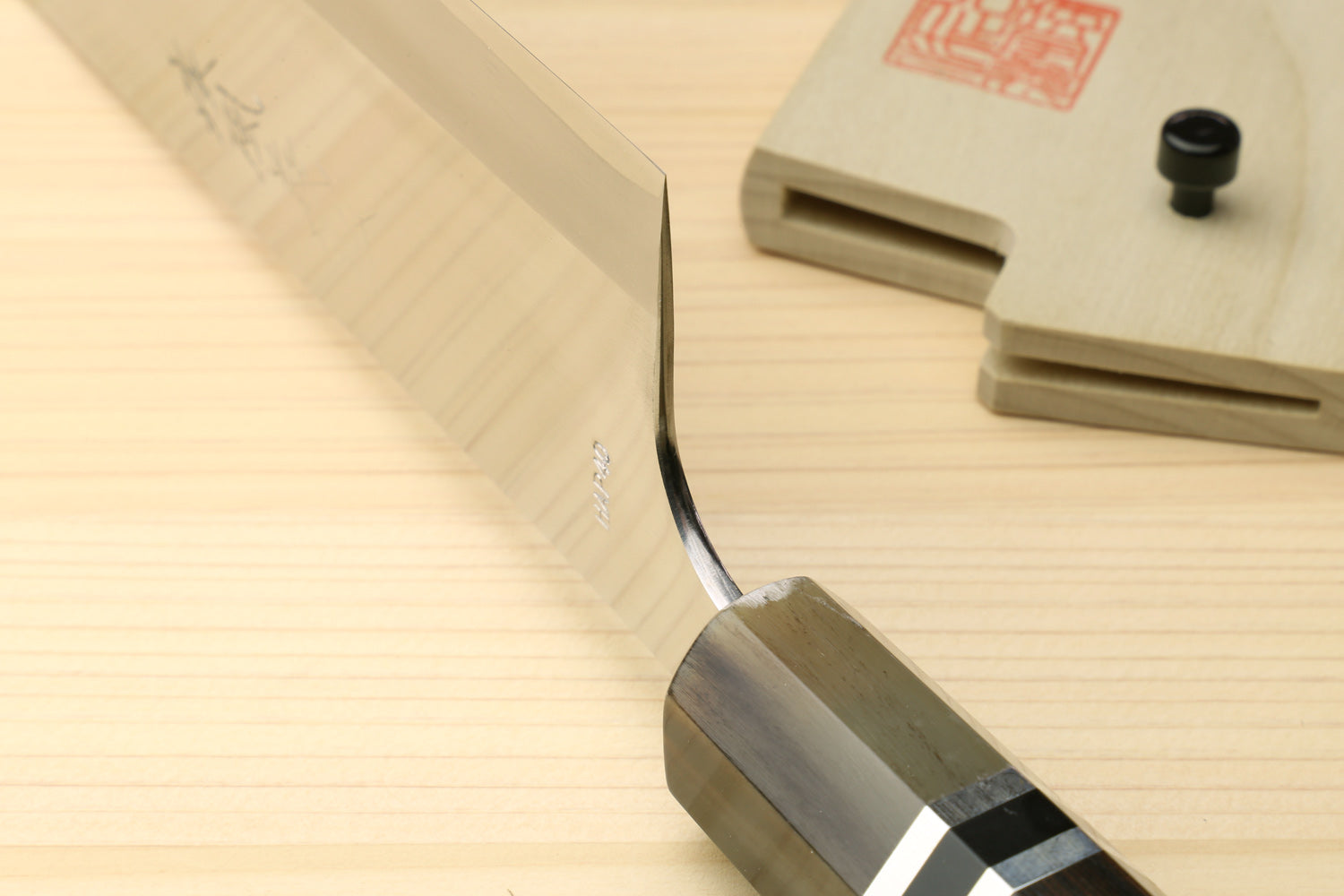 Featuring a core clad in softer stainless steel for enhanced durability and ease of maintenance, this knife is equipped with an ambidextrous octagonal premium ebony wood handle, complemented by a double bolster for balance and comfort. It also includes a magnolia wood saya cover, which is easy to clean and resistant to stains and odors.