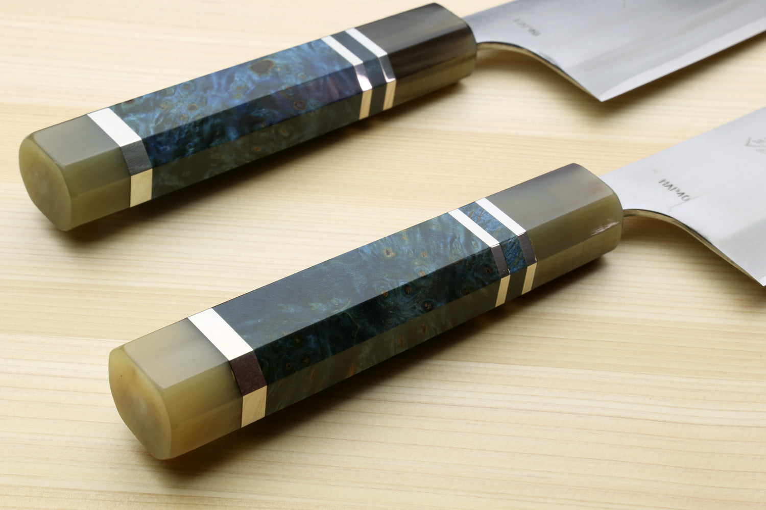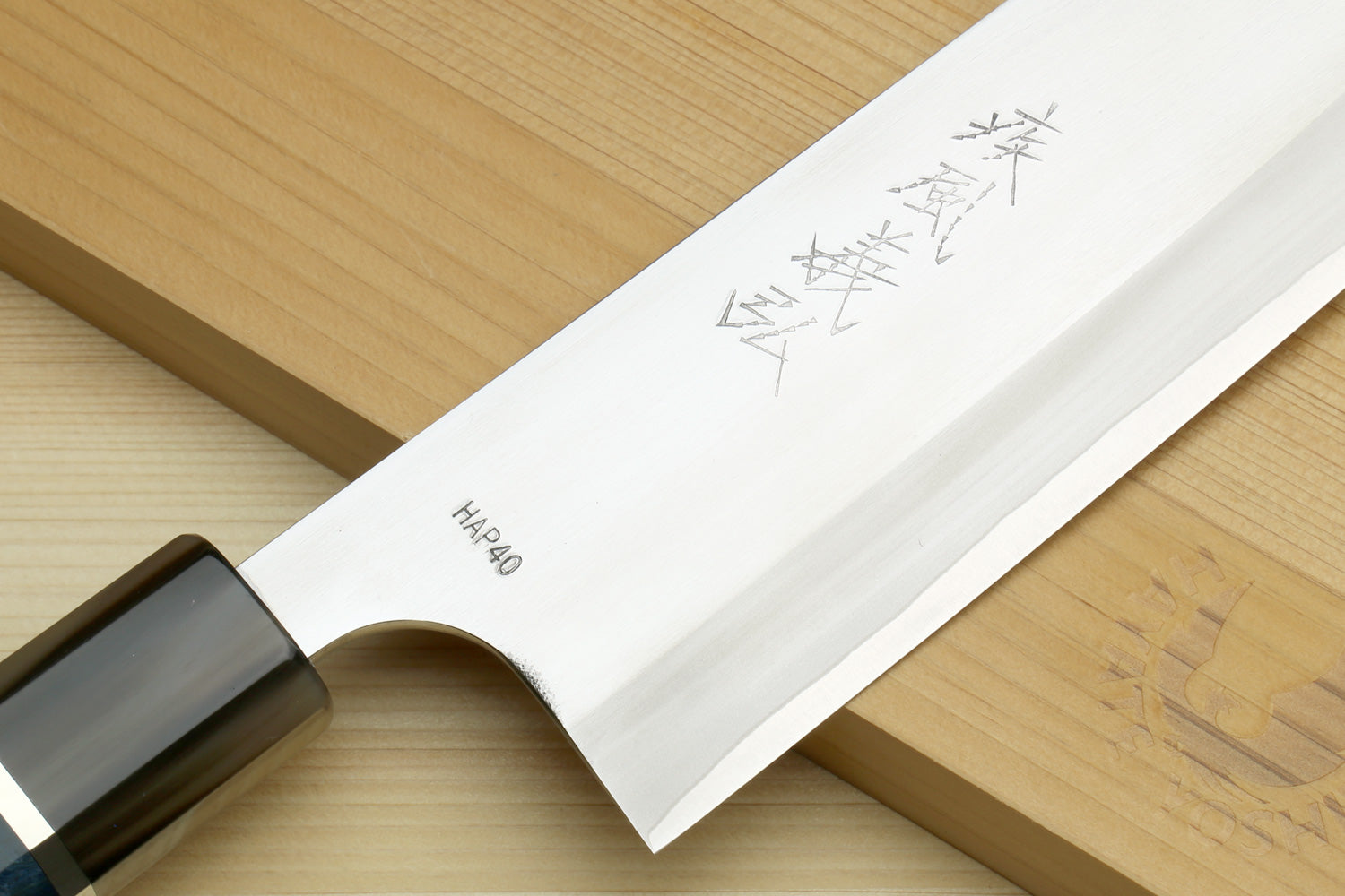 The high-speed stainless steel core is clad with a softer stainless steel, providing exceptional toughness and unmatched edge retention. Complemented by a traditional Premium Ocean Blue handle with a full tang, this knife offers a balanced and comfortable grip, making it an ideal choice for professionals engaged in daily high-volume prep work. Whether you're tackling a busy kitchen or preparing a gourmet meal, the HAP40 Santoku will enhance your culinary experience.