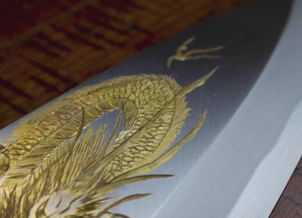 This one-of-a-kind Yoshihiro Hongasumi Deba knife features an exclusive hand-etched design using pure gold, elevating it beyond the functional to a true work of art. It displays the iconic five-story Japanese pagoda (Goj?-no-t?). Each design is a masterpiece in its own right, making the knives as much a display piece as they are a high-performance kitchen tool.