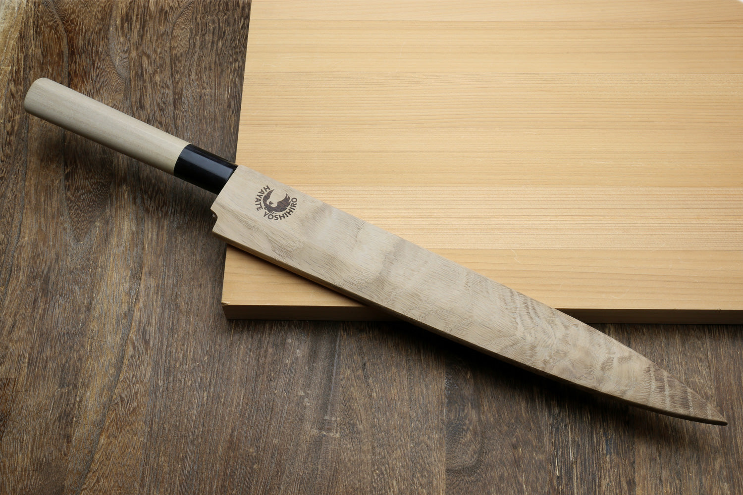 This saya cover is specifically made for Yoshihiro Knives and may not be compatible with knives from other brands. Additionally, please note that it does not fit our Kurouchi Black forged knives. Should you have any questions regarding compatibility, please reach out through our Contact page or call us at (310) 777-0227. Experience a more convenient, durable, and premium knife protection solution with our Oak magnetic saya, proudly made in Japan.
