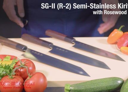 Introducing the Yoshihiro SG2 (R2) Series Knives, expertly crafted to meet the demands of professional chefs working in fast-paced kitchen environments. The SG-2 Powdered Stainless Steel core (also known as R2) offers remarkable sharpness with a hardness rating of HRC 63-64, ensuring excellent edge retention while maintaining ease of sharpening due to its low wear resistance. This makes it an ideal choice for chefs who require high performance without the need for frequent maintenance. Each knife is equipped with a lacquer-coated wooden sheath, providing resistance to unwanted odors, stains, and chipping, and ensuring easy cleaning. These knives come ready to use right out of the box and are 100% handcrafted in Japan, not mass-produced.