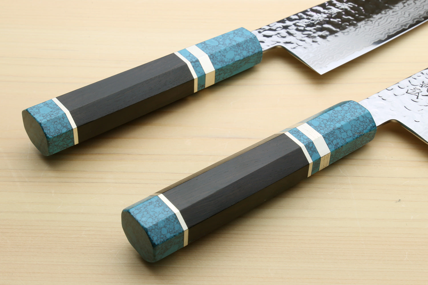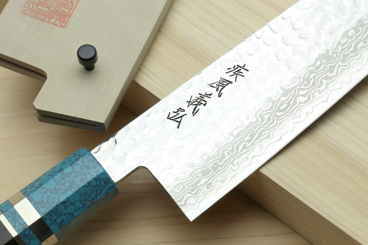 Its traditional Wa-style octagonal Turquoise Blue handle, crafted from ebony with a turquoise bolster, is ergonomic and lightweight, fitting naturally in the hand for comfortable, extended use. The included wooden Saya sheath protects the blade while adding to its elegant presentation. The hammered blade reduces friction and prevents food from sticking, ensuring smooth, precise cutting.