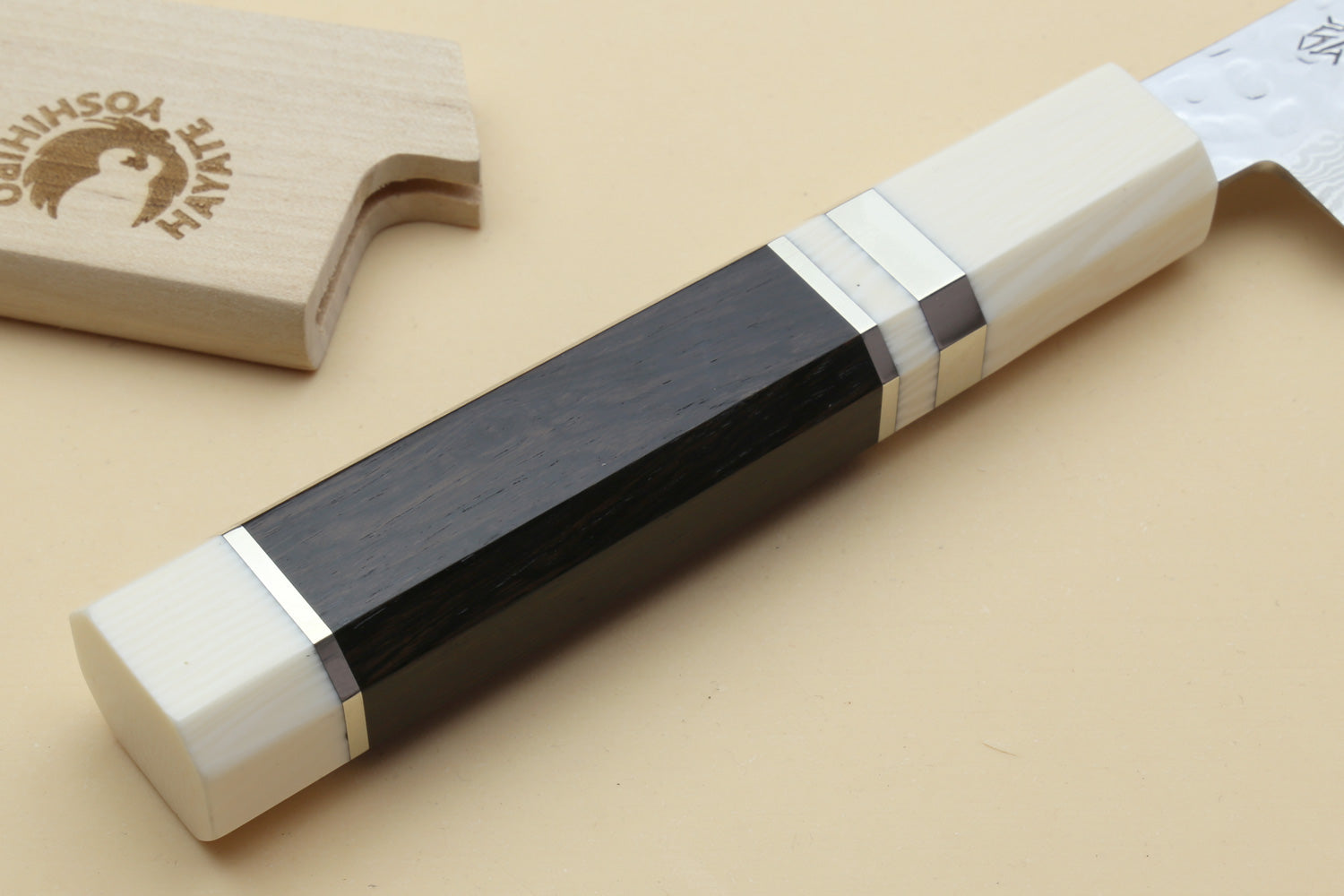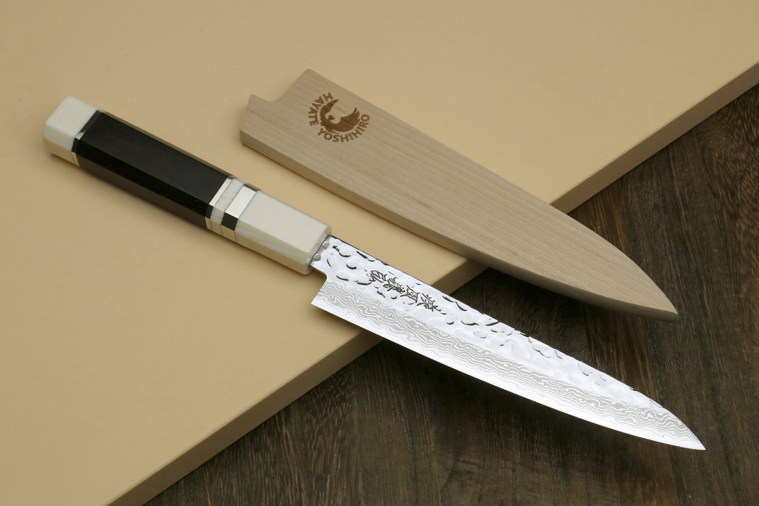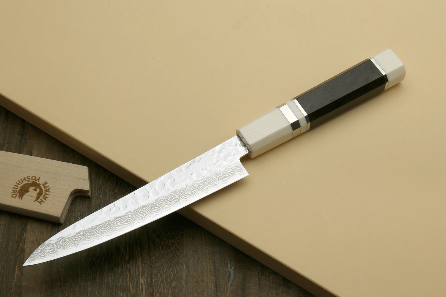 Our Yoshihiro VG-10 Hammered Damascus Petty Knife is forged with care to create a sturdy blade that excels in both small and large tasks. Crafted with 46 layers of steel in the Damascus tradition, this knife has a VG-10 Core that offers exceptional sharpness and durability. Complemented by a traditional Japanese-style handcrafted Octagonal ebony Handle affixed with an alternative ivory bolster, it is as beautiful as it is functional. The Saya, a protective wooden sheath, is included to protect the knife when not in use and adds to its elegance. The hammered texture of the blade reduces friction, ensuring food won't stick to it. Every knife from Yoshihiro is meticulously handcrafted by master artisans, creating a unique and one-of-a-kind work of art.