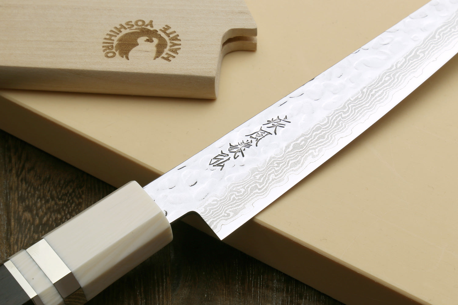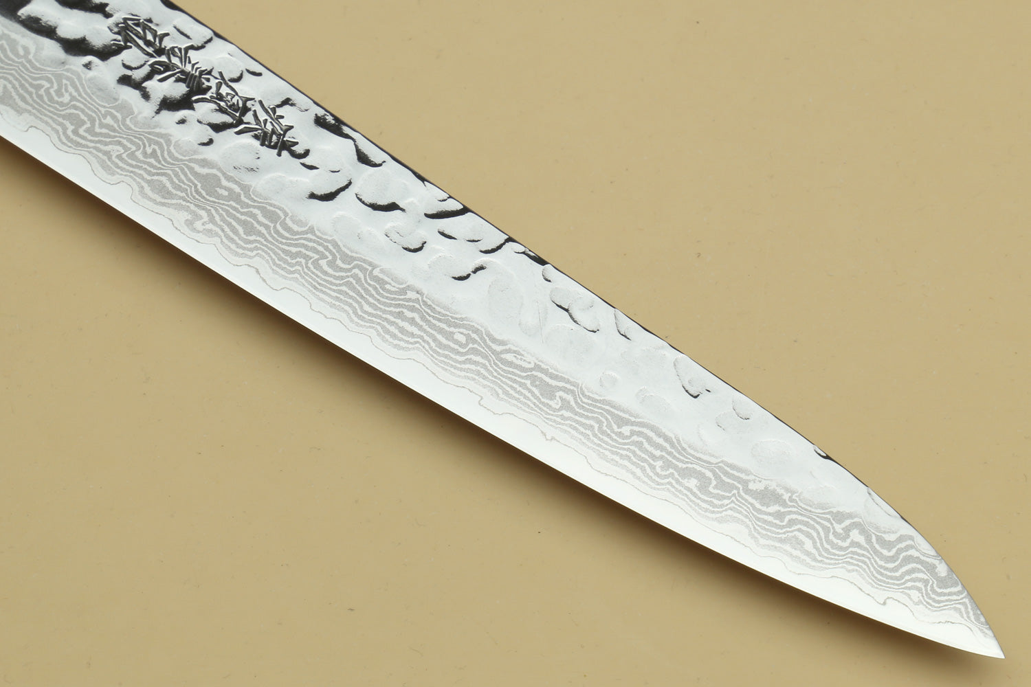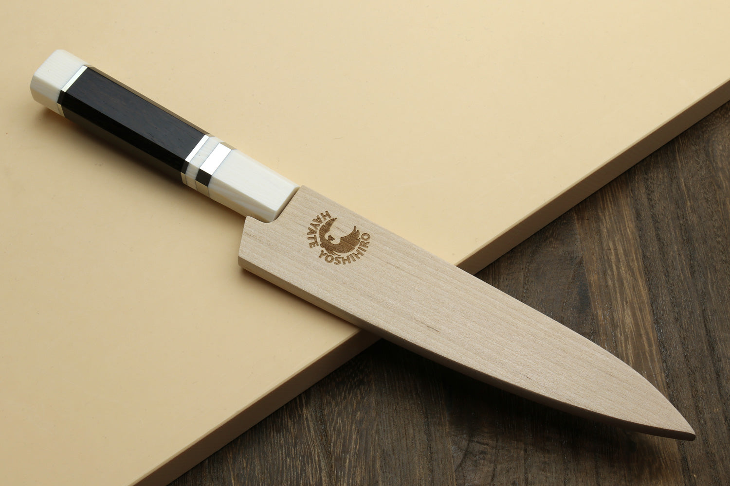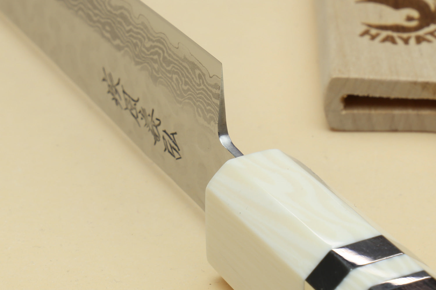 Our Yoshihiro VG-10 Hammered Damascus Petty Knife is forged with care to create a sturdy blade that excels in both small and large tasks. Crafted with 46 layers of steel in the Damascus tradition, this knife has a VG-10 Core that offers exceptional sharpness and durability. Complemented by a traditional Japanese-style handcrafted Octagonal ebony Handle affixed with an alternative ivory bolster, it is as beautiful as it is functional. The Saya, a protective wooden sheath, is included to protect the knife when not in use and adds to its elegance. The hammered texture of the blade reduces friction, ensuring food won't stick to it. Every knife from Yoshihiro is meticulously handcrafted by master artisans, creating a unique and one-of-a-kind work of art.
